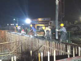 永安污水处理厂施工员夜间也在加班加点在调节池的构架上浇筑池壁砼