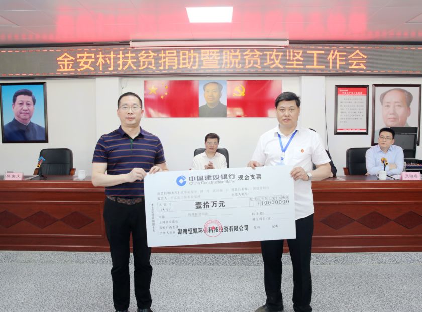 多年来,恒凯环保在自身发展的同时,积极履行社会责任,先后参加了郴州苏仙区教育精准扶贫、湖南“人文住建”精准消费扶贫、长沙开福区捞刀河防洪救灾等公益活动,捐献了上百万防疫物资支持新冠疫情防控,积极参与“万企帮万村”精准扶贫行动,并荣获全国“万企帮万村”精准扶贫行动先进民营企业。
